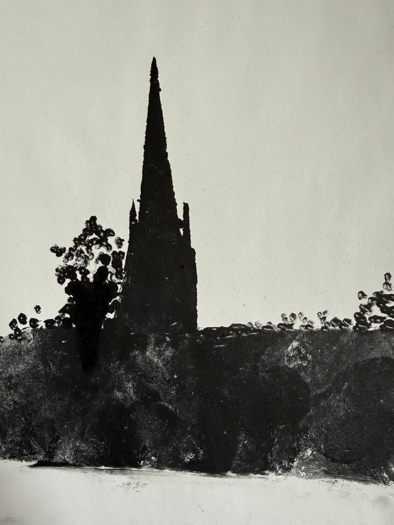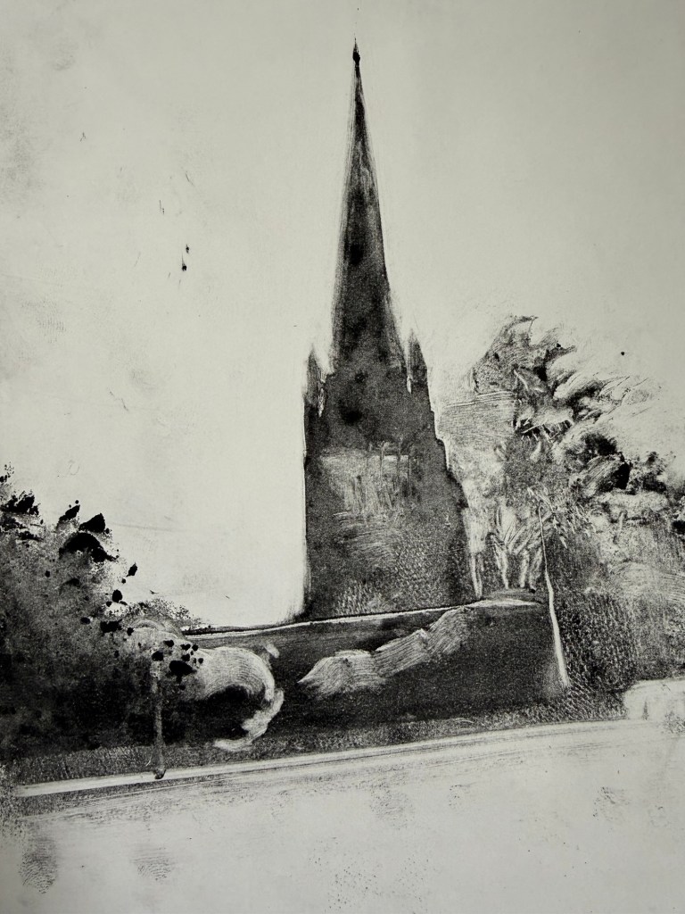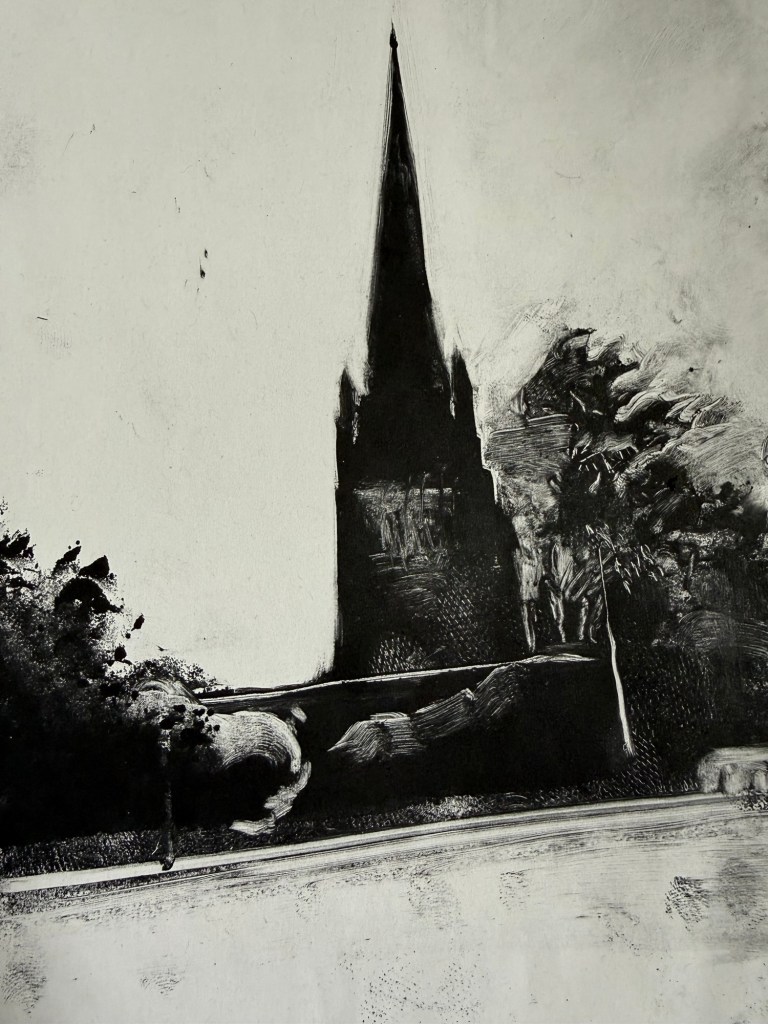 This weekend I have been working on some mono prints using St. George’s church as inspiration. I lightly soaked some cartridge paper in water and used oil based ink. Using cotton buds, ink dabber and a cloth to wipe away sections I wanted to be light. I then passed the inked acrylic plate through the press.
