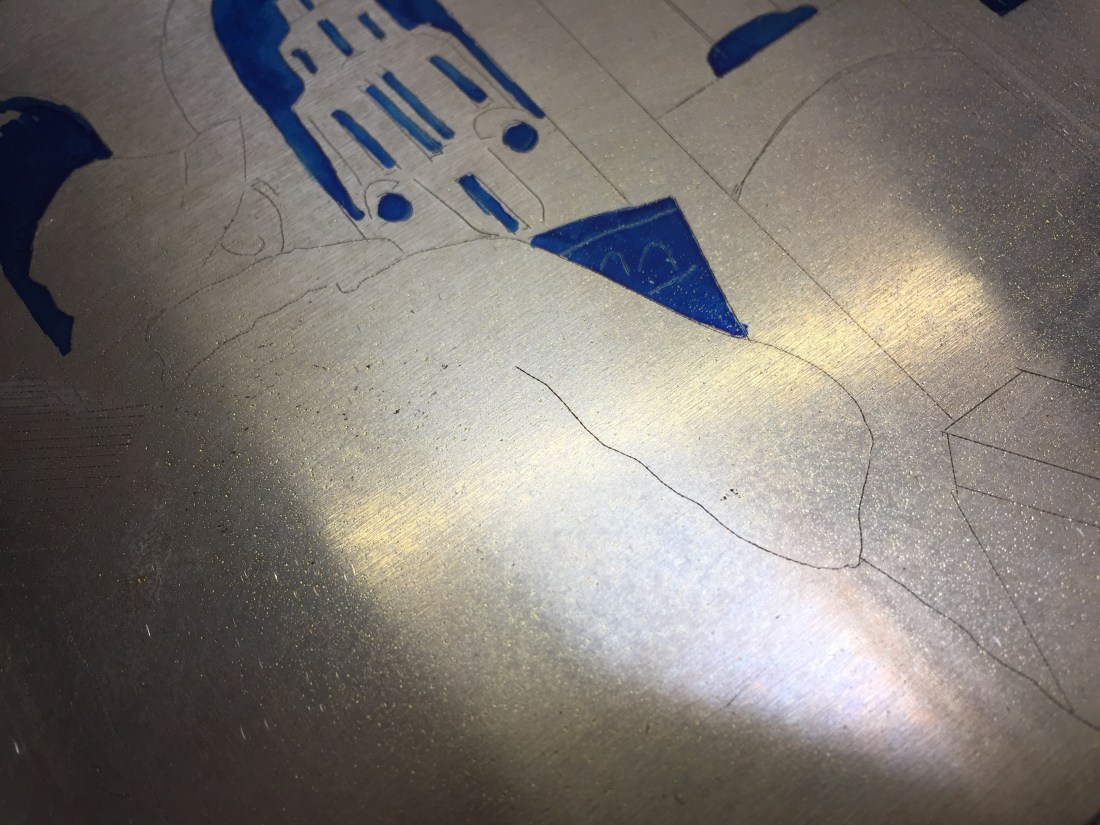 Yesterday, I was working on one of my last prints for this year which was my long awaited Lowry print. As you can see from the photos, after I had burnt on the aquatint resin, I then stopped out areas of the plate using a circuit board pen which is great for small detail. Applying stop out prevents certain areas from being etched by the acid (usually areas to leave white). I then repeat the acid bath process over a number of times know as “bites”. Depending on the time the plate is bathed in the acid and the strength of the solution to water, you get various tonal affects. Lighter tones usually only take a few seconds; darker tones take longer.