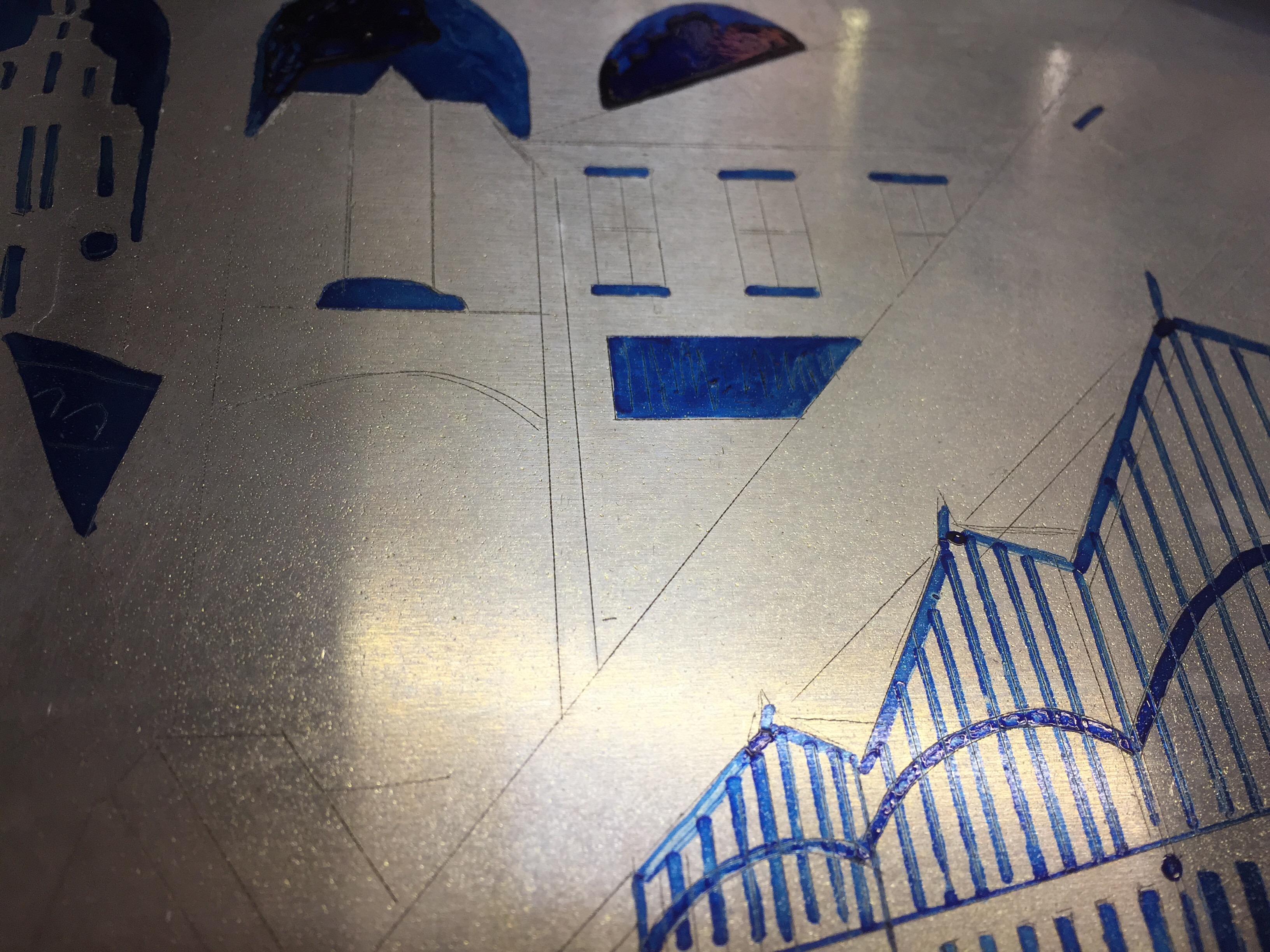 Yesterday, I was working on one of my last prints for this year which was my long awaited Lowry print. As you can see from the photos, after I had burnt on the aquatint resin, I then stopped out areas of the plate using a circuit board pen which is great for small detail. Applying stop out prevents certain areas from being etched by the acid (usually areas to leave white). I then repeat the acid bath process over a number of times know as “bites”. Depending on the time the plate is bathed in the acid and the strength of the solution to water, you get various tonal affects. Lighter tones usually only take a few seconds; darker tones take longer.